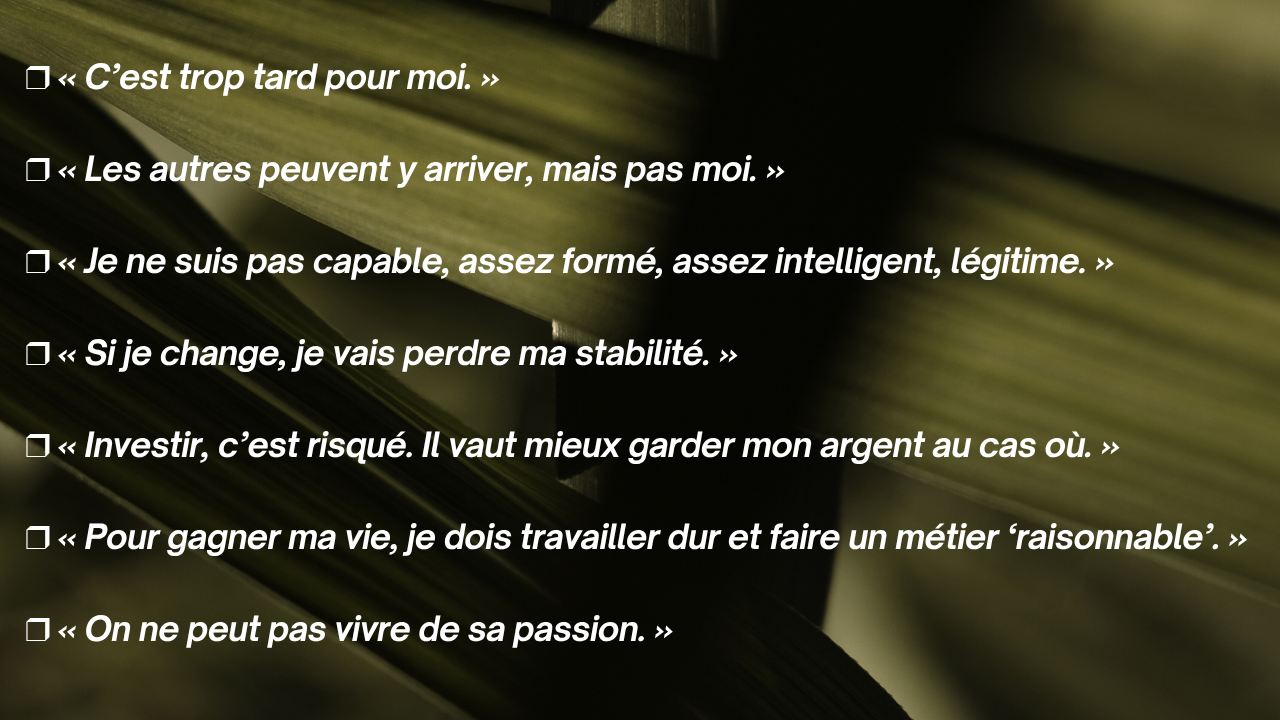 Ces affirmations personnelles que ton cerveau a décidé de considérer comme vraies, souvent pour te protéger, parfois pour t’éviter de souffrir, mais qui aujourd’hui t’empêchent d’avancer.